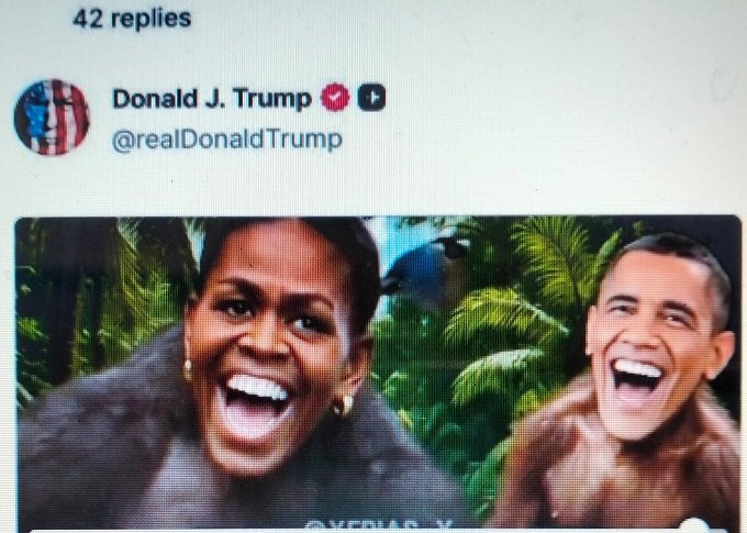 La Casa Blanca se quejó este viernes de lo que calificó como "falsa indignación" después de que Donald Trump publicara un video en el que aparecían el ex presidente Barack Obama y su esposa Michelle caracterizados como monos. "Es un video meme de internet que...