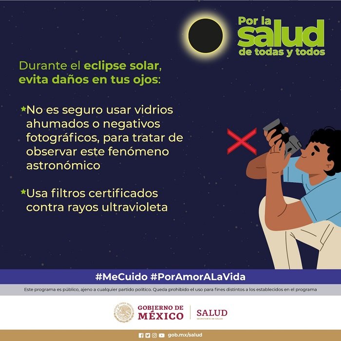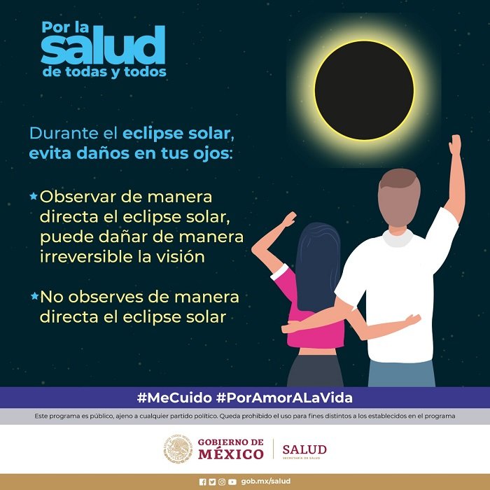 La Secretaría de Salud recomienda a la población evitar observar de manera directa el eclipse solar anular que ocurrirá el 14 de octubre, debido a que los rayos ultravioleta pueden causar daños irreversibles en la vista.
