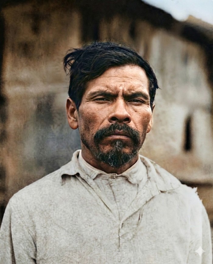 Caminaba con el cuerpo acostumbrado al terreno. Su rostro parecía tallado por luz dura: pómulos marcados, mandíbula firme y frente amplia donde el sol cae sin intermediarios. Las cejas densas protegían unos ojos atentos al horizonte. La piel tostada, curtida por temporadas agrícolas, guardaba pequeñas manchas dispersas por el tiempo y el clima. En la barbilla y en las mejillas asomaba una barba irregular; el bigote se fundía con esa aspereza. El sombrero de palma domaba la verticalidad del sol. La camisa clara de manta, suelta, dejaba ver antebrazos fuertes; el pantalón grueso y los huaraches recogían el polvo fino de la meseta. Cada prenda respondía al trabajo.