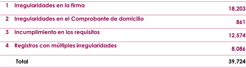 Las principales irregularidades o inconsistencias detectadas relacionadas con la firma fueron: firmas ilegibles, fotocopias de la firma en lugar de firma autógrafa o falta de coincidencia con la firma de la Credencial para Votar (CPV). En el rubro de comprobantes de domicilio se detectaron con la alteración de datos, comprobantes apócrifos, registros reiterados con el mismo comprobante y comprobantes que no cumplen con la vigencia requerida. También, se encontraron documentos apócrifos, direcciones inexistentes, así como registros incompletos, por ejemplo, con falta de algún requisito o firma.