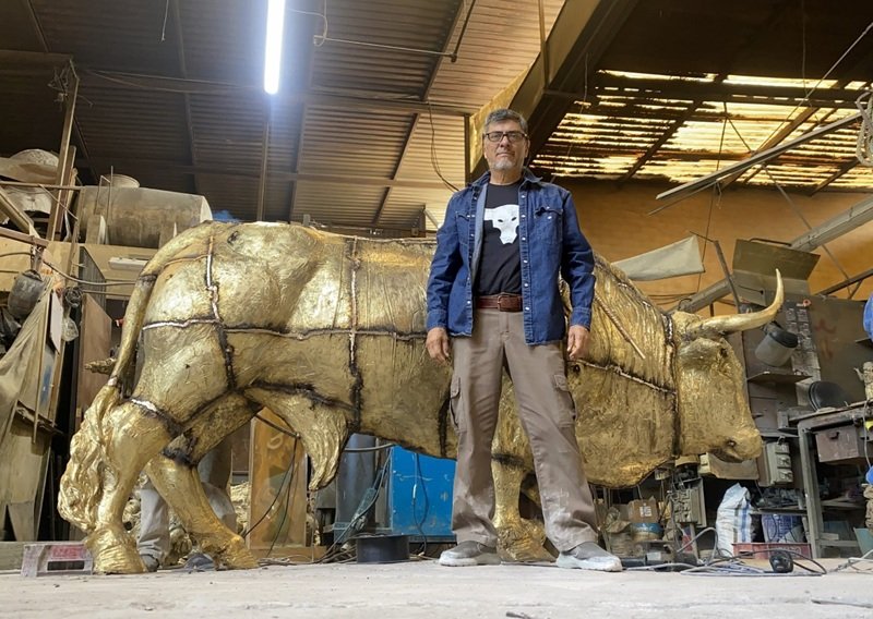 FOTO principal: Durante el proceso de fundición, Sergio Peraza, frente al enorme toro que hoy forma parte del conjunto escultórico de bronce en honor del torero Arturo Macías, ubicado al exterior de la Plaza de Toros Monumental de Aguascalientes. 𝗙𝗼𝘁𝗼: © 𝗔𝗿𝗰𝗵𝗶𝘃𝗼 𝗦𝗲𝗿𝗴𝗶𝗼 𝗣𝗲𝗿𝗮𝘇𝗮