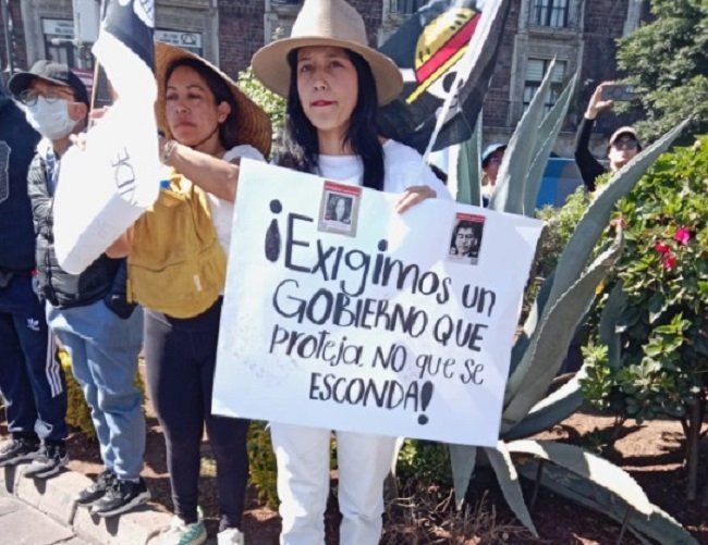 En otro punto del Zócalo, una manta de la Colectiva Feminista Ehécatl reunía a madres y padres buscadores de varios estados. Caminaban en silencio, sosteniendo el estandarte que mencionaba Nayarit, Puebla, Michoacán, Jalisco e Hidalgo. Su presencia recordaba que la crisis de desapariciones antecede a cualquier gobierno y se ha convertido en una herida abierta que no cierra.