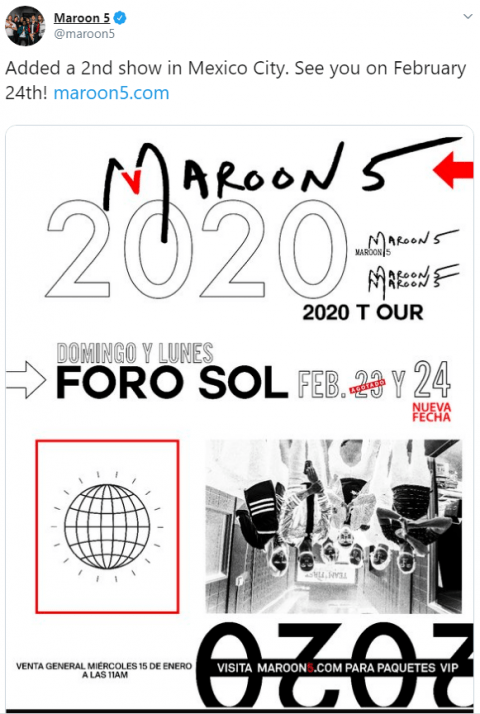 Maroon 5, la banda de rock pop de Los Ángeles, California, liderada por el vocalista Adam Levine, anunció nueva fecha en México para el 24 de febrero luego de que el concierto programado para un día antes agotara las entradas rápidamente.