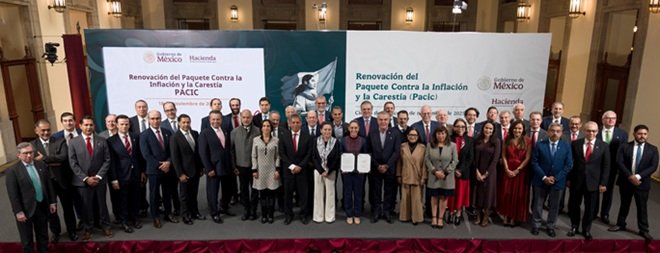 La Presidenta de México Claudia Sheinbaum Pardo firmó, con tiendas de autoservicio y agroindustrias, la renovación del Paquete Contra la Inflación y la Carestía (Pacic), que mantiene en 910 pesos el precio de los 24 productos de la canasta básica, es decir, no aumenta su precio y con ello se cuida la economía popular.