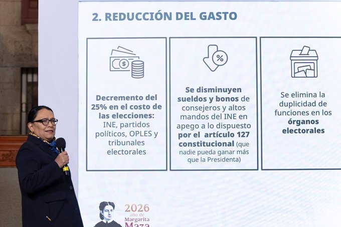 En la propuesta explicada por la secretaría de Gobernación, Rosa Icela Rodríguez se plantea la reducción del 25 por ciento del gasto en la organización electoral, impactando en los recursos del Instituto Nacional Electoral, los Organismos Públicos Locales Electorales, el financiamiento de los partidos políticos y los Tribunales Electorales.
