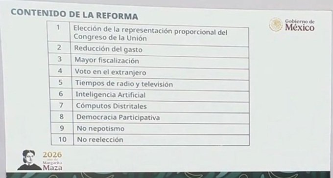 Ayer, en presentación Power Point, Claudia Sheinbaum dio más señales de lo estará incluido en la reforma electoral, algo que la sociedad civil no ha pedido, pero el gobierno se ha encargo de esparcir a través de su narrativa de la necesidad de ella.